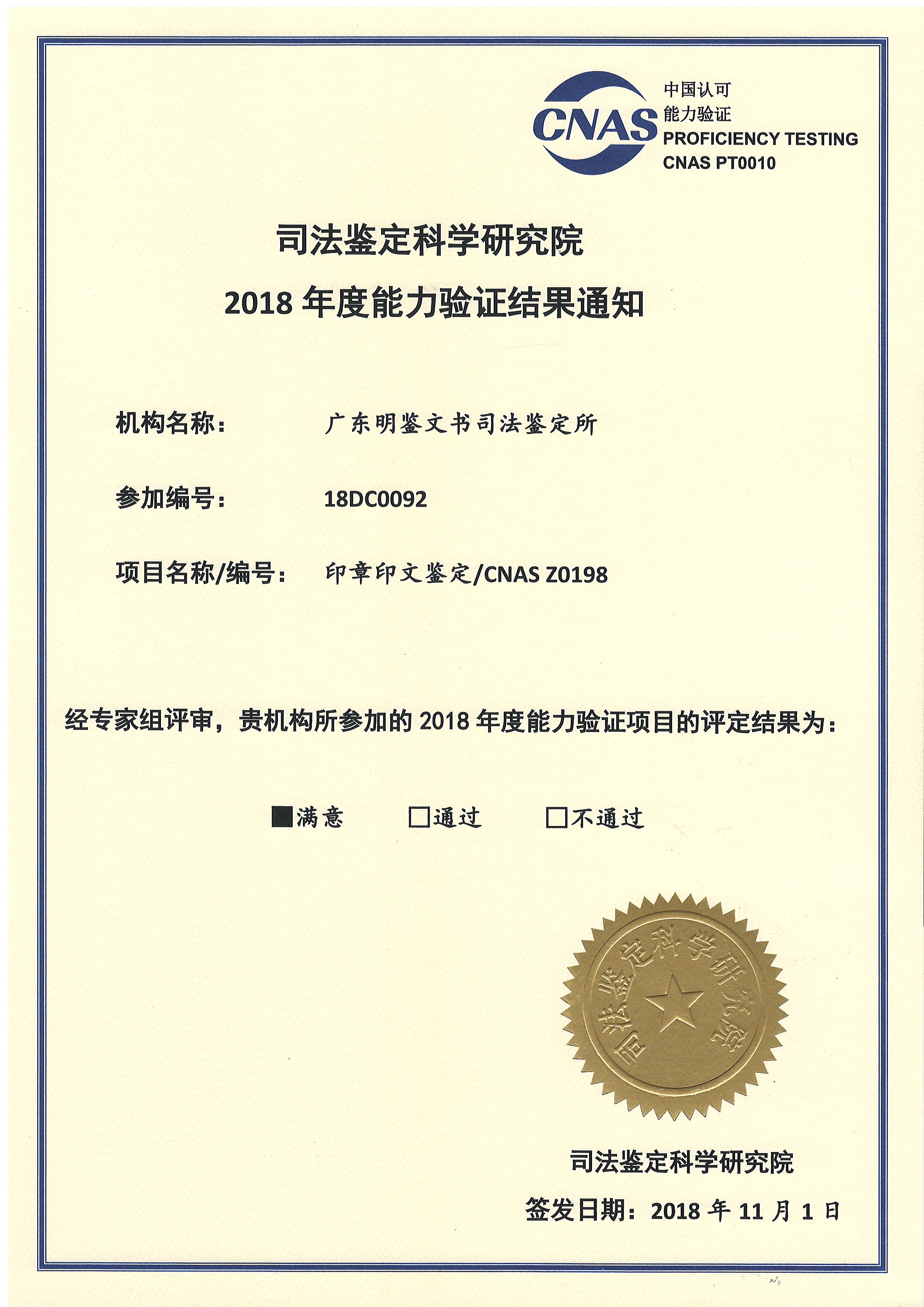 2018年能力验证结果通知(印章鉴定)