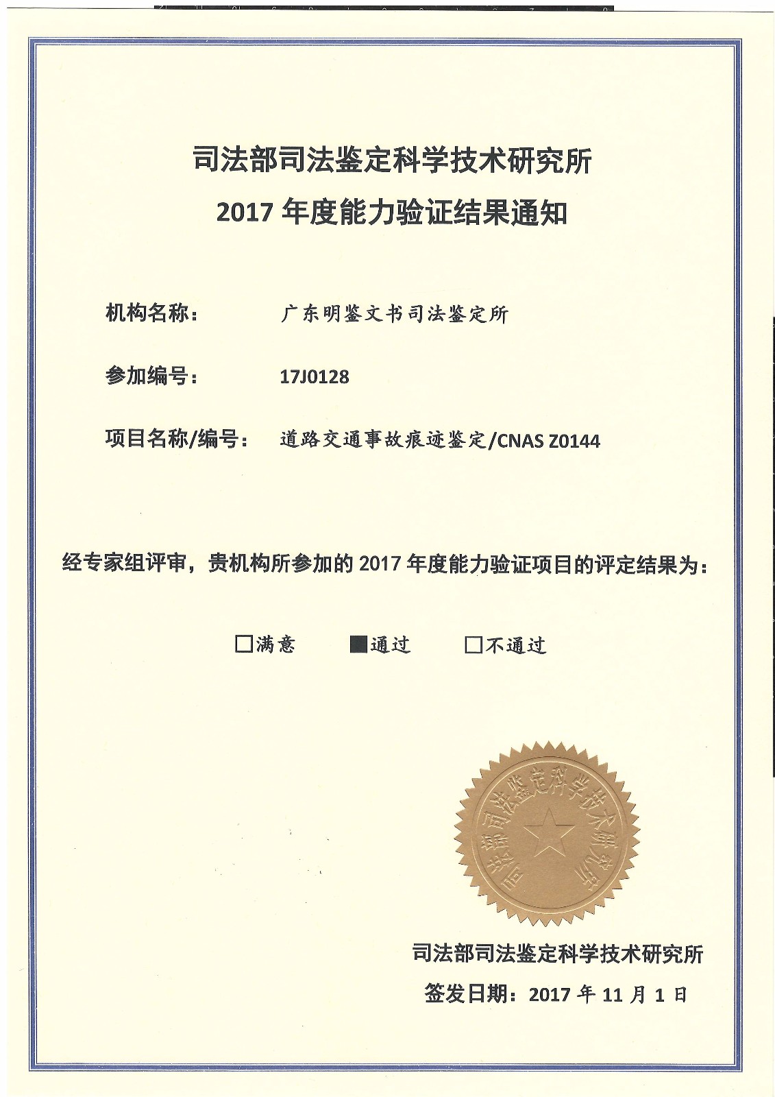 2017年能力验证结果通知(道路交通事故痕迹)